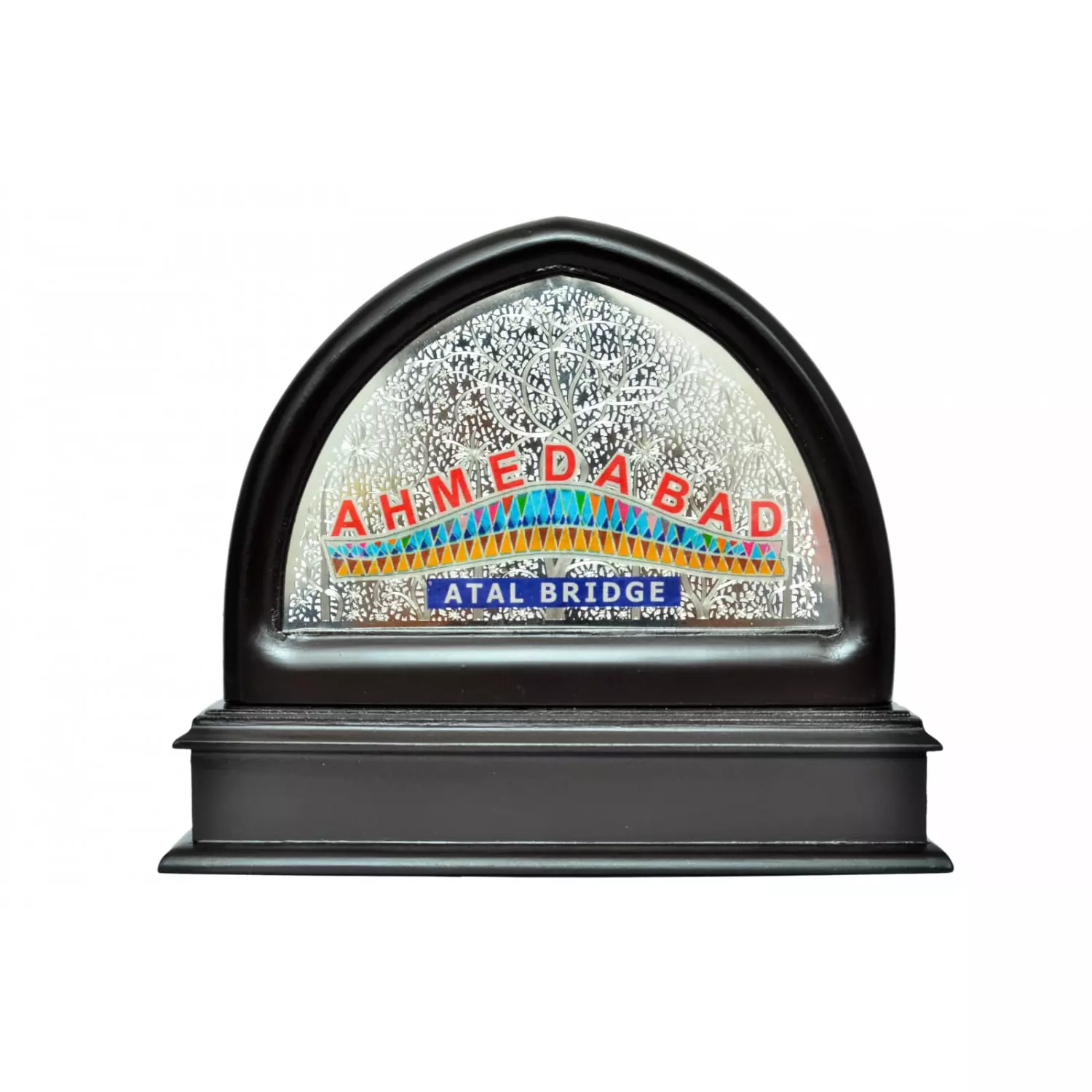 Celebrate the timeless heritage and modern innovation of Ahmedabad with a unique souvenir featuring the iconic Sidi Saiyyed Mosque Jali and the stunning Atal Bridge.